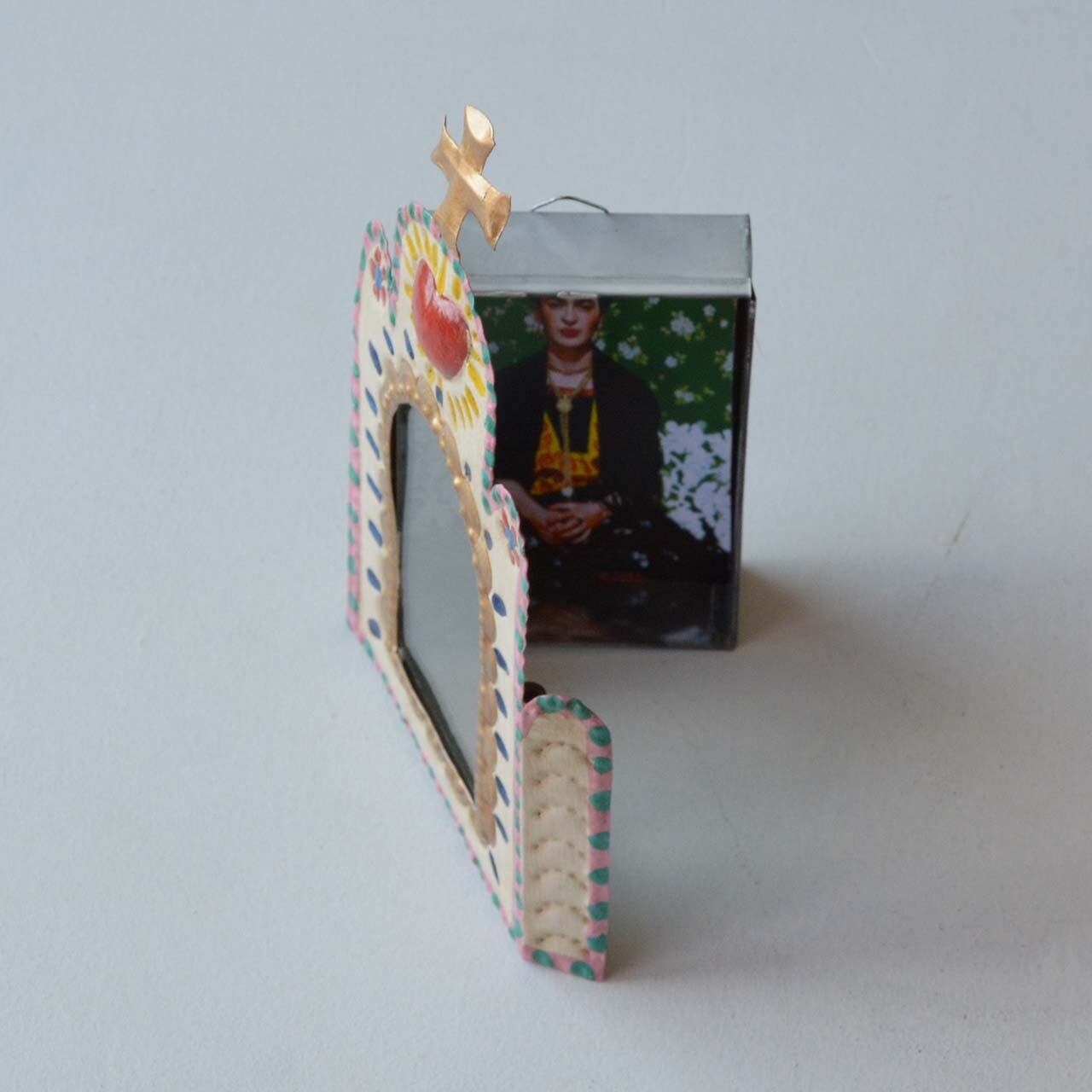 メキシコ中央高原地帯にある、サンミゲル・デ・アジェンテで作られているブリキの壁掛けです。手作りのブリキ細工にひとつひとつ絵付けがされています。ニチョと呼ばれるこのタイプは窓が開閉可能で、このままの絵柄で飾って頂いても、お手持ちの写真などに取り替えて頂くこともできます。