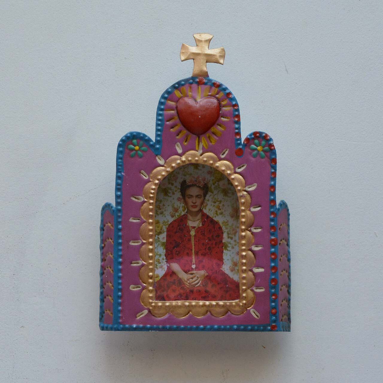 メキシコ中央高原地帯にある、サンミゲル・デ・アジェンテで作られているブリキの壁掛けです。手作りのブリキ細工にひとつひとつ絵付けがされています。ニチョと呼ばれるこのタイプは窓が開閉可能で、このままの絵柄で飾って頂いても、お手持ちの写真などに取り替えて頂くこともできます。