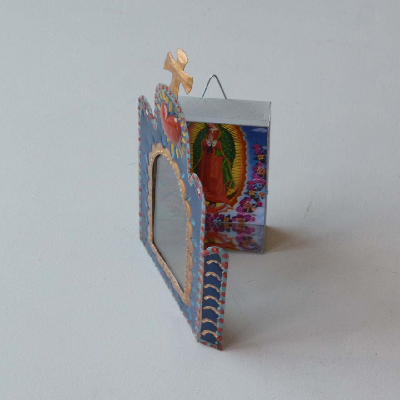 メキシコ中央高原地帯にある、サンミゲル・デ・アジェンテで作られているブリキの壁掛けです。手作りのブリキ細工にひとつひとつ絵付けがされています。ニチョと呼ばれるこのタイプは窓が開閉可能で、このままの絵柄で飾って頂いても、お手持ちの写真などに取り替えて頂くこともできます。