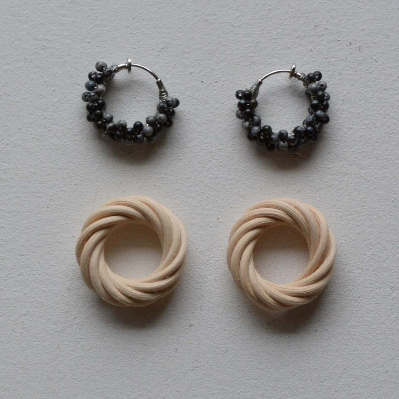天然石を編み込んだフープイヤリングとラタンのパーツを組み合わせてお楽しみいただけます。