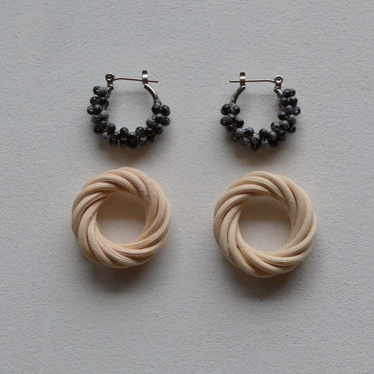 天然石を編み込んだフープピアスとラタンのパーツを組み合わせてお楽しみいただけます。