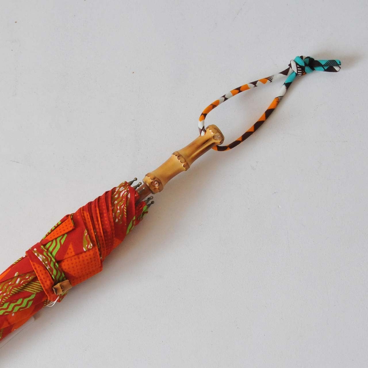 西アフリカのバーニュを使用した生地で作る傘です。こちらは摩擦や色落ちなどデメリットのある生地ですが、ポップな配色や、大胆な図柄、図柄に意味のあるモチーフなどアフリカの魅力満載です。