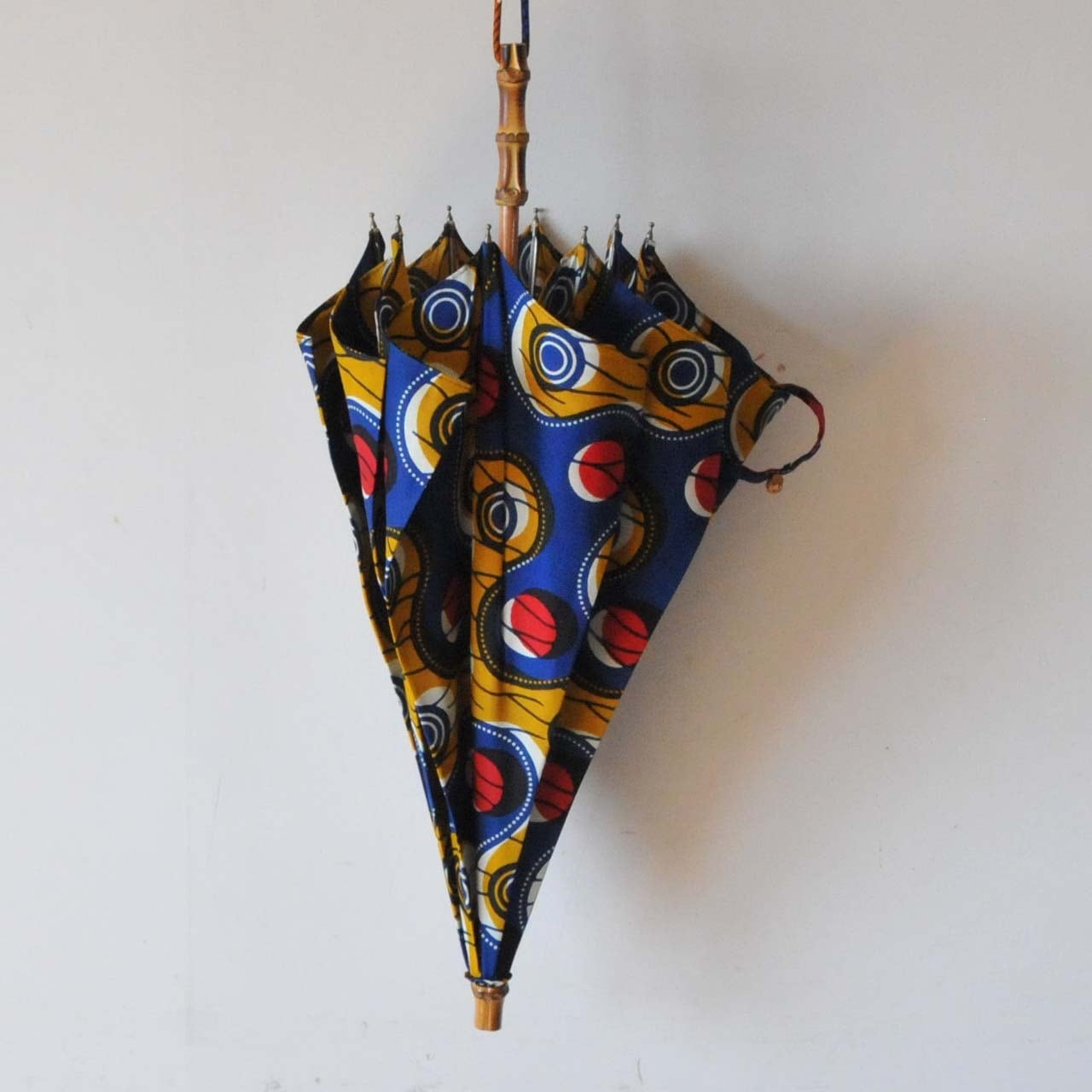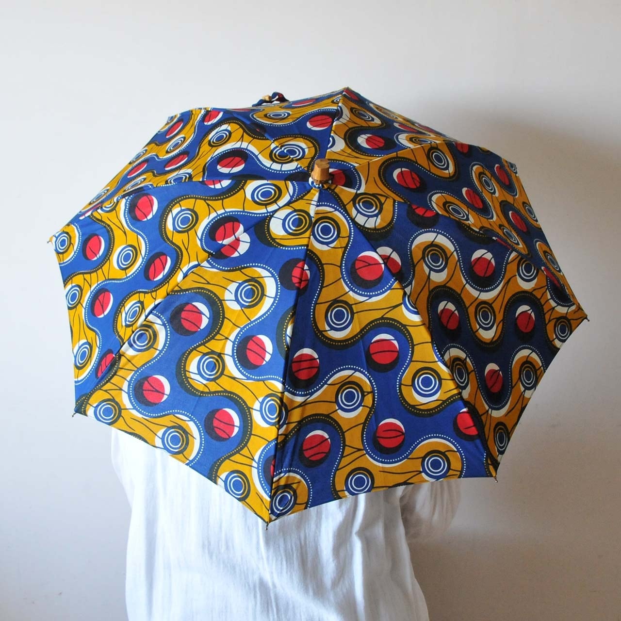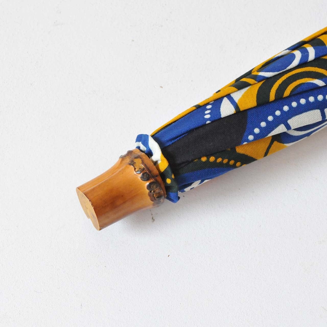 西アフリカのバーニュを使用した生地で作る傘です。こちらは摩擦や色落ちなどデメリットのある生地ですが、ポップな配色や、大胆な図柄、図柄に意味のあるモチーフなどアフリカの魅力満載です。