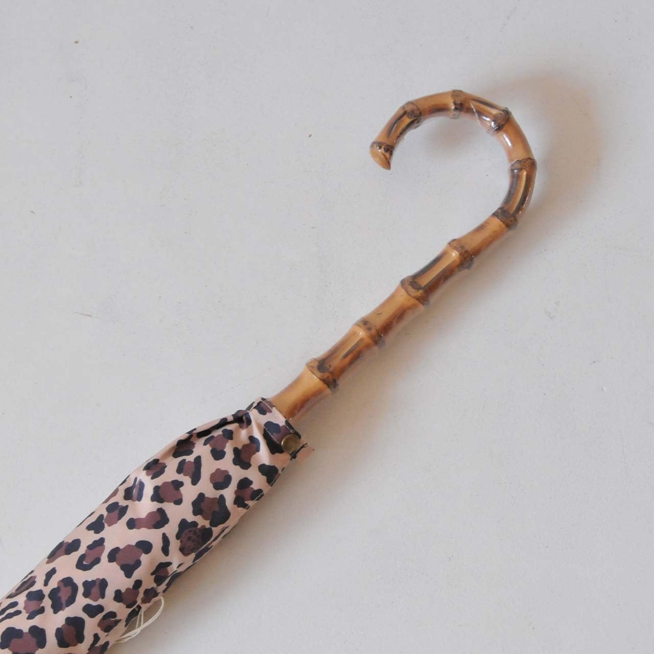 オリジナルテキスタイルレオパード⻑傘。じっくり⾒ると、ところどころにレオパードの顔とbonのアルファベットが描かれています。こちらの⻑傘、クラシカルな印象になるよう、親⾻の⻑さ58cm、ハンドルの⻑さ20cm、⽯突の⻑さ7cmとなるよう設計しております。