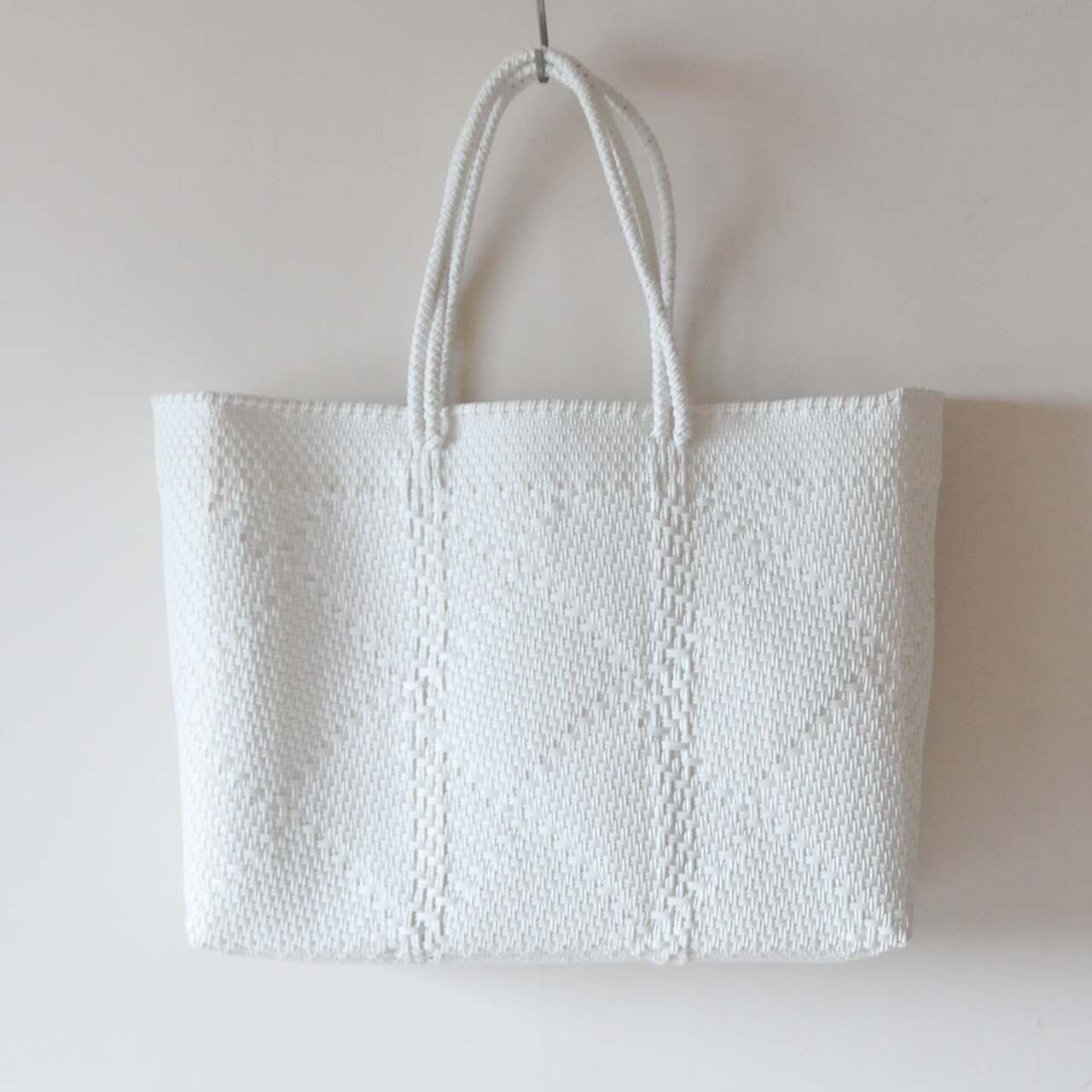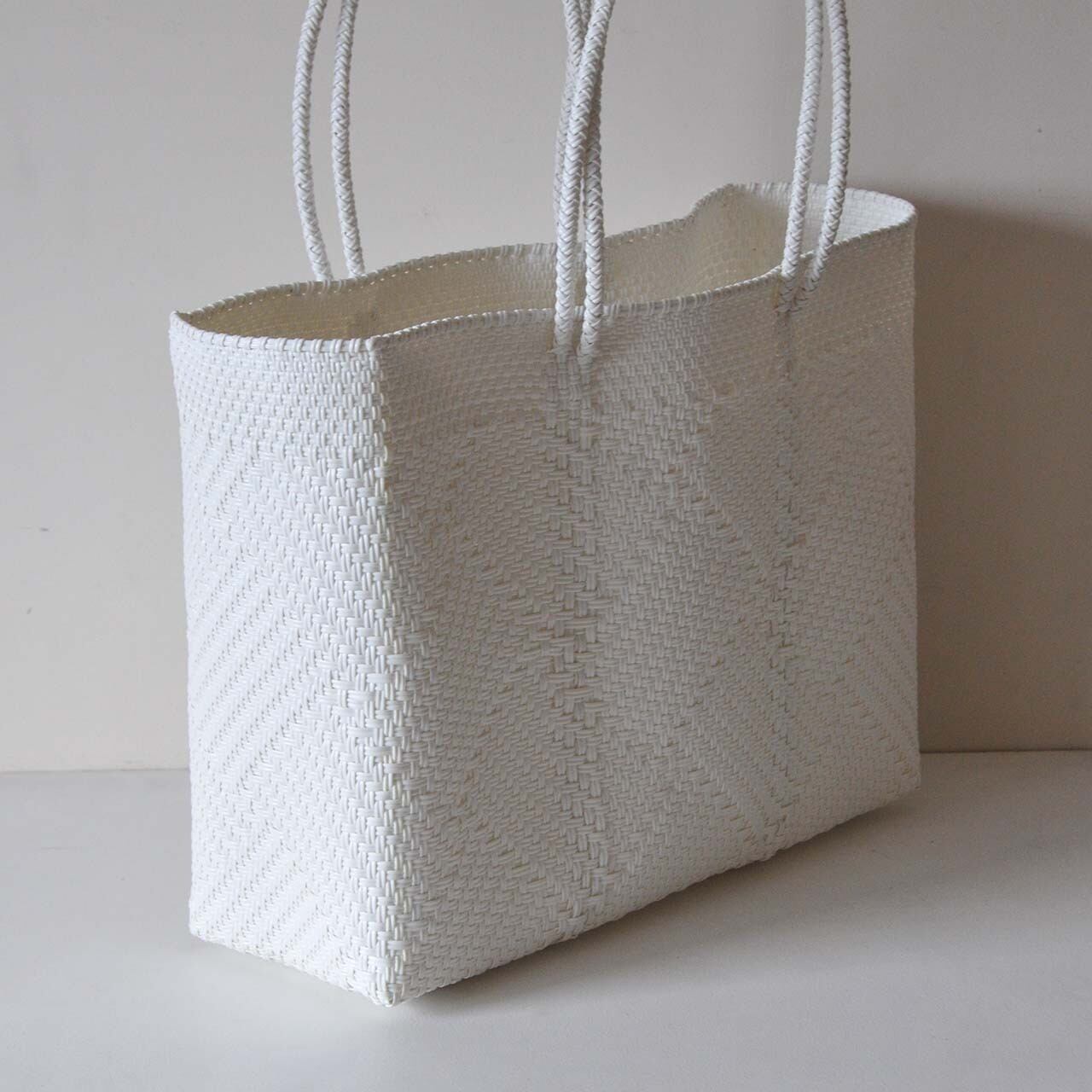 素材がプラスチック製の紐なのにちっともチープには見えず、シンプルなコーディネイトのアクセントになるアイテムです。メキシコの職人の手で一つ一つ編まれ、模様や色の組み合わせはさまざまです。大変丈夫で雨の日も気にせず使え、汚れても丸ごと洗えて大変便利です。