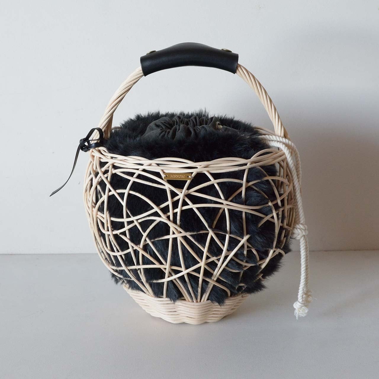 藤のかご+レザーハンドルカバー+リネンの巾着+エコファーのセットです。